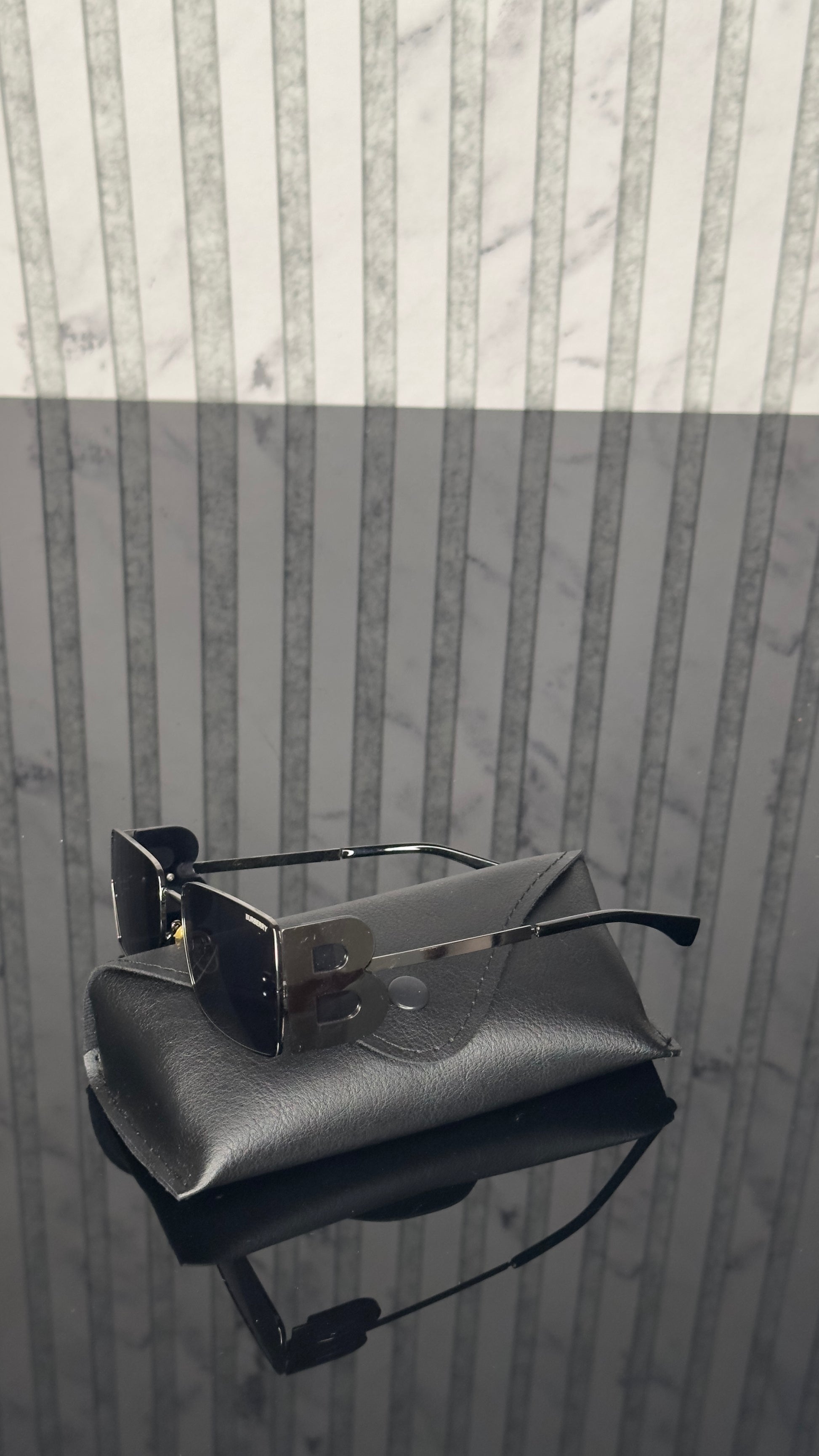 Οι σκούροι φακοί χαρίζουν μυστήριο και στυλ, ενώ το χαρακτηριστικό λογότυπο “B” στους βραχίονες προσθέτει τη μοναδική ταυτότητα του οίκου.