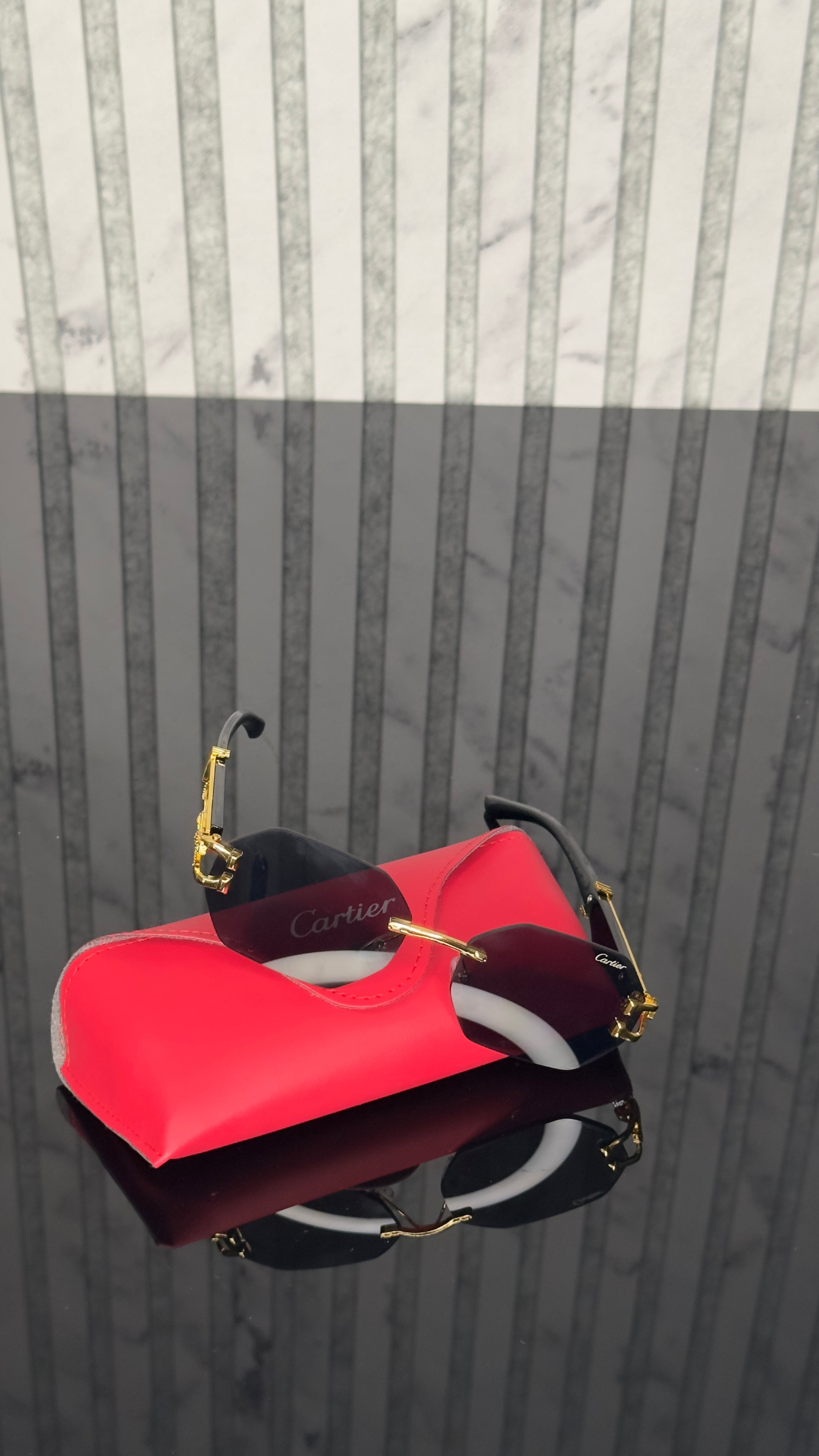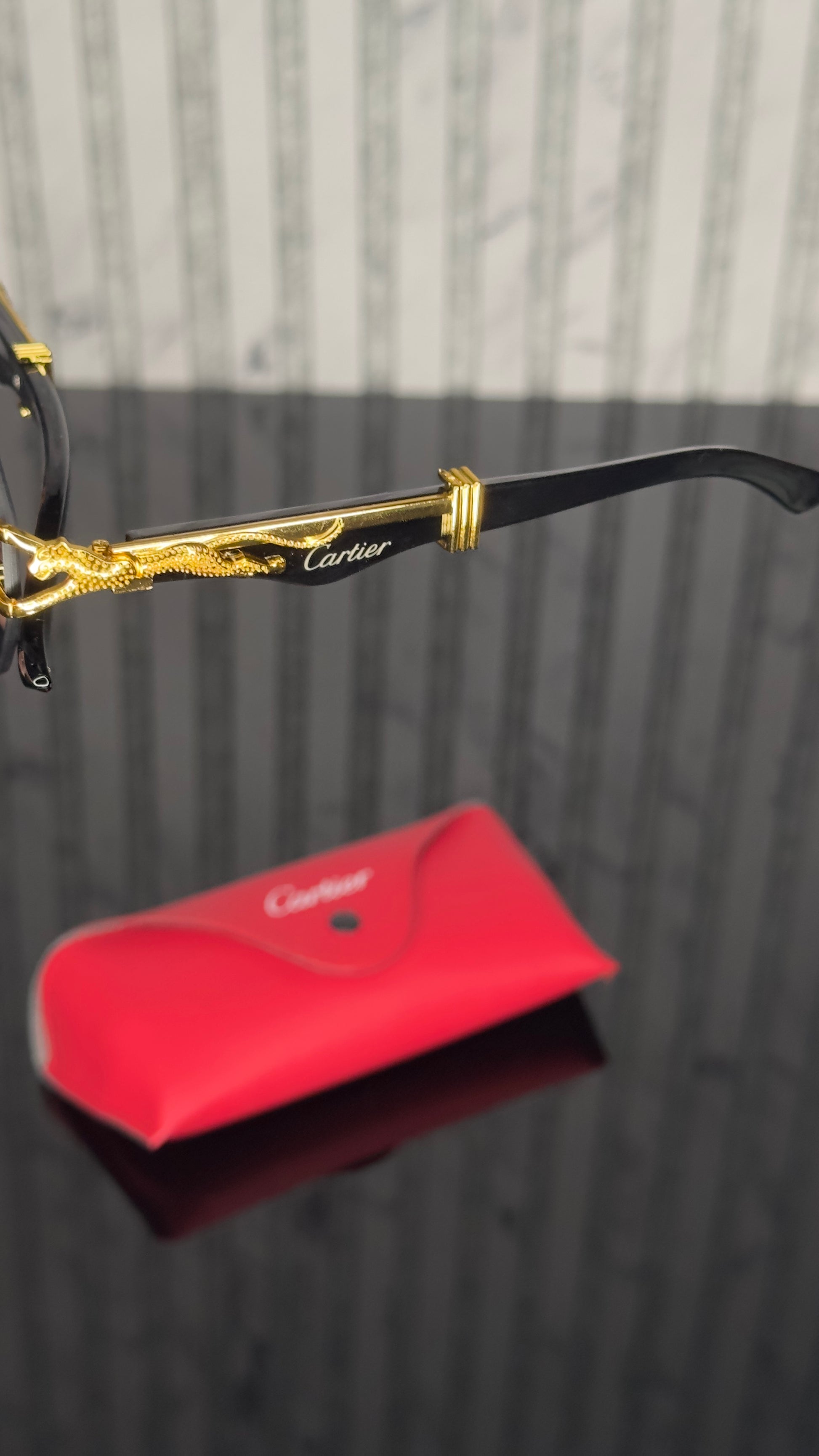 Το rimless σχέδιο συνδυάζεται με τους εντυπωσιακούς βραχίονες που κοσμούνται από το εμβληματικό μοτίβο του πάνθηρα, σύμβολο ισχύος και διαχρονικής κομψότητας της Cartier.