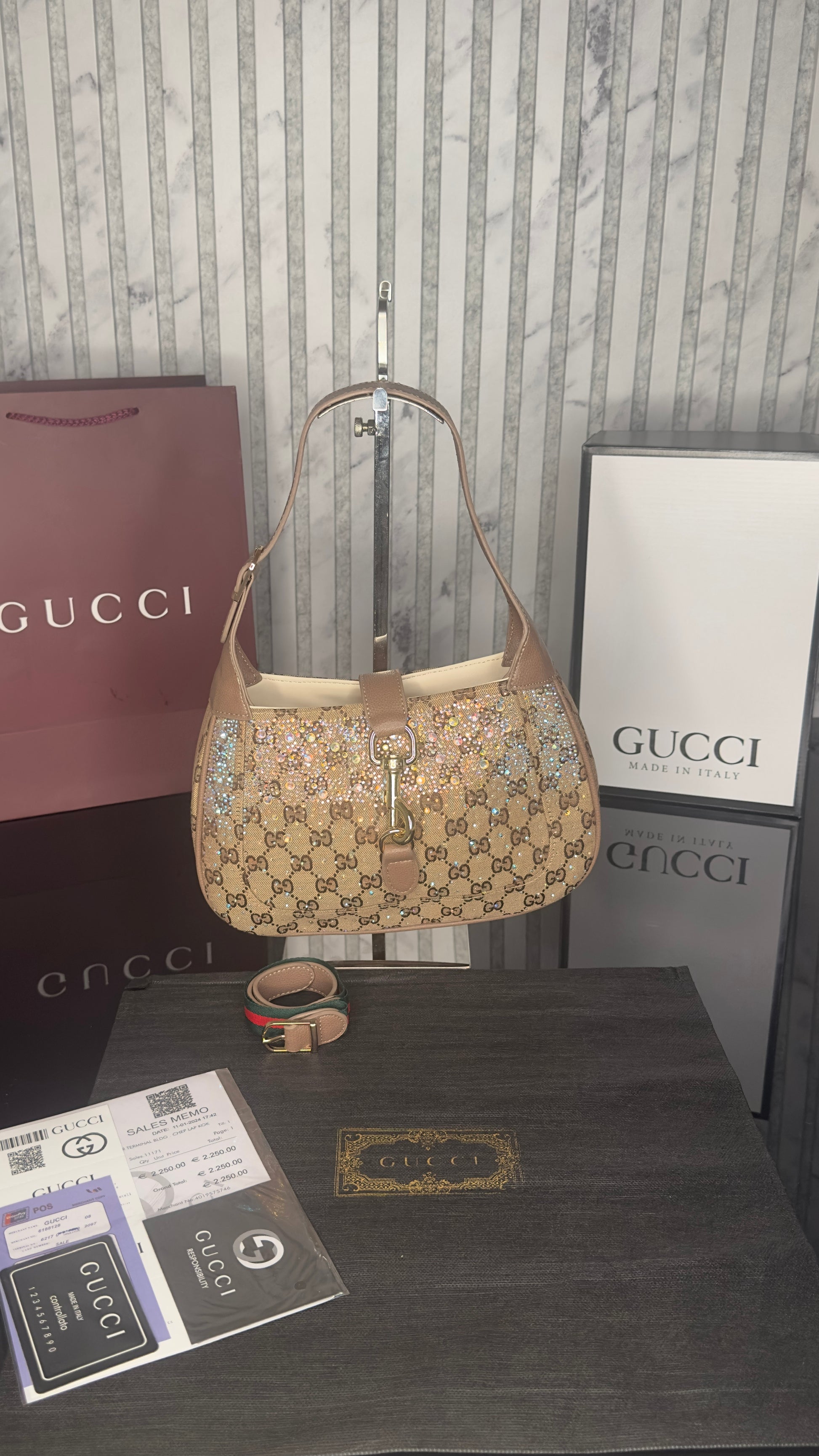 Η iconic Gucci Jackie 1961 επιστρέφει σε μια λαμπερή εκδοχή, διακοσμημένη με GG Supreme canvas και πολυτελή crystal strass που προσθέτουν διακριτική λάμψη.