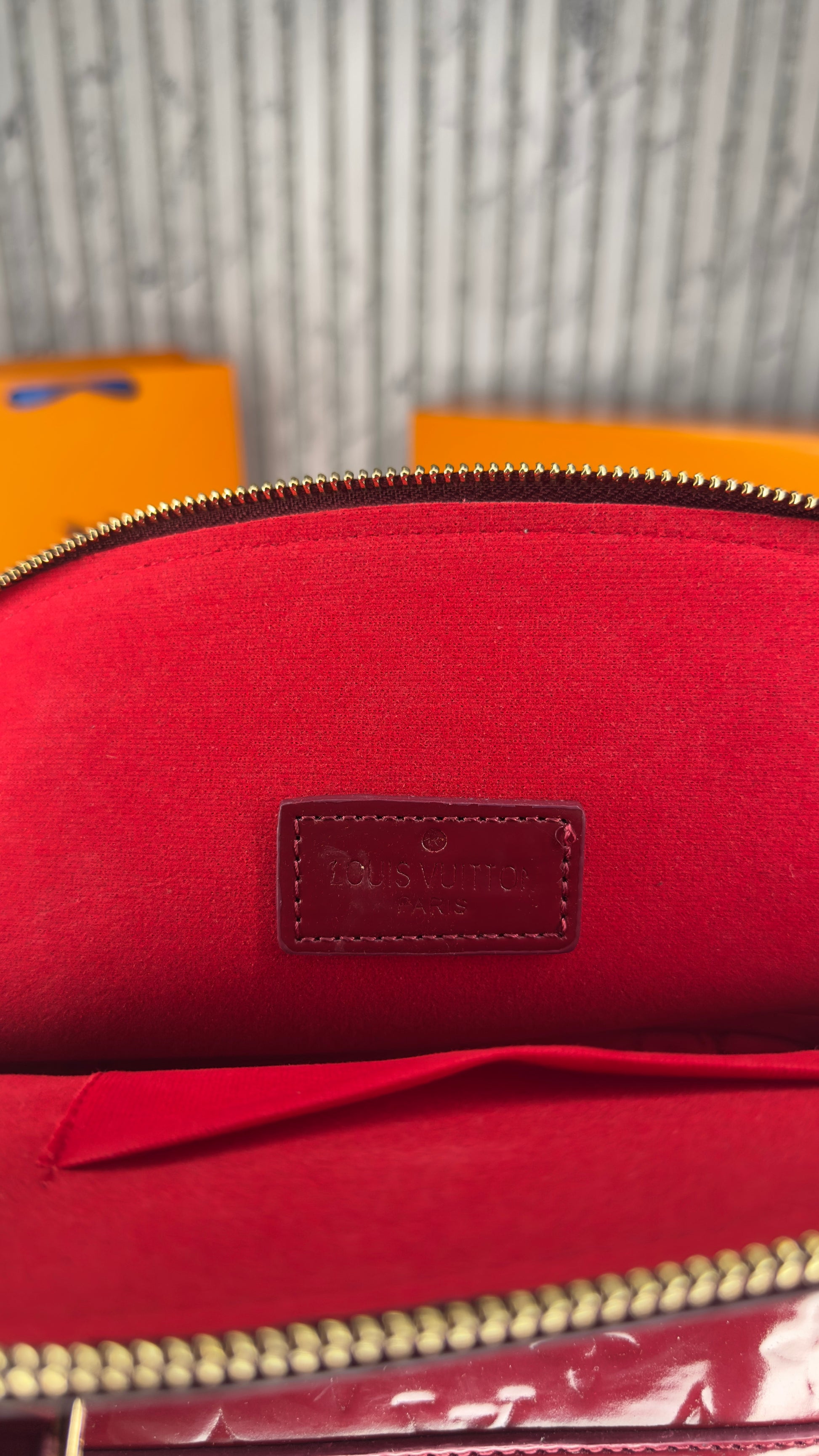 Η Louis Vuitton Alma BB Vernis είναι ένα από τα πιο αναγνωρίσιμα και διαχρονικά σχέδια του οίκου. Κατασκευασμένη από patent Vernis leather σε βαθύ μπορντό (amarante), φέρει το χαρακτηριστικό Monogram LV σε ανάγλυφη μορφή, που προσθέτει λάμψη και κομψότητα.