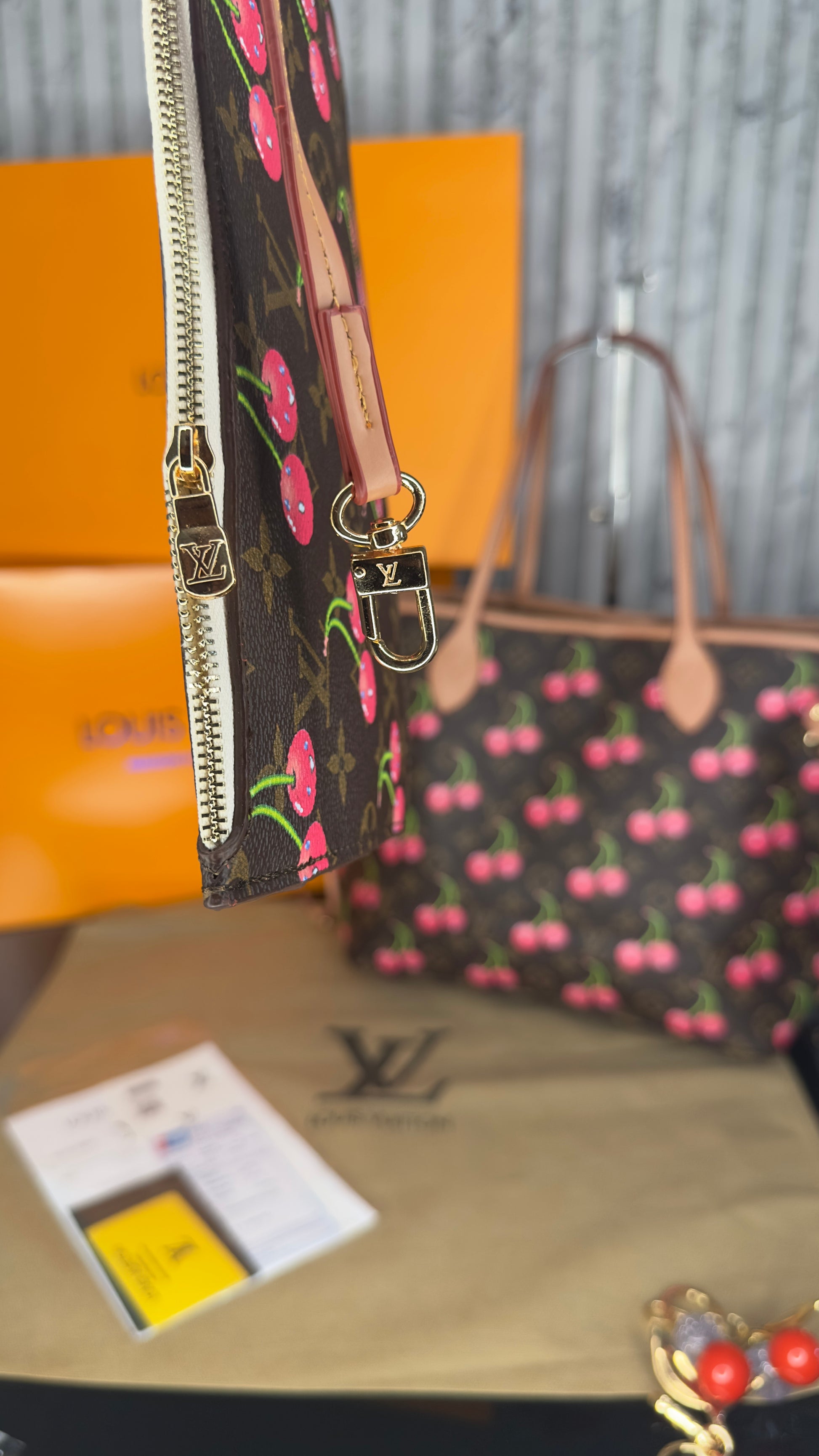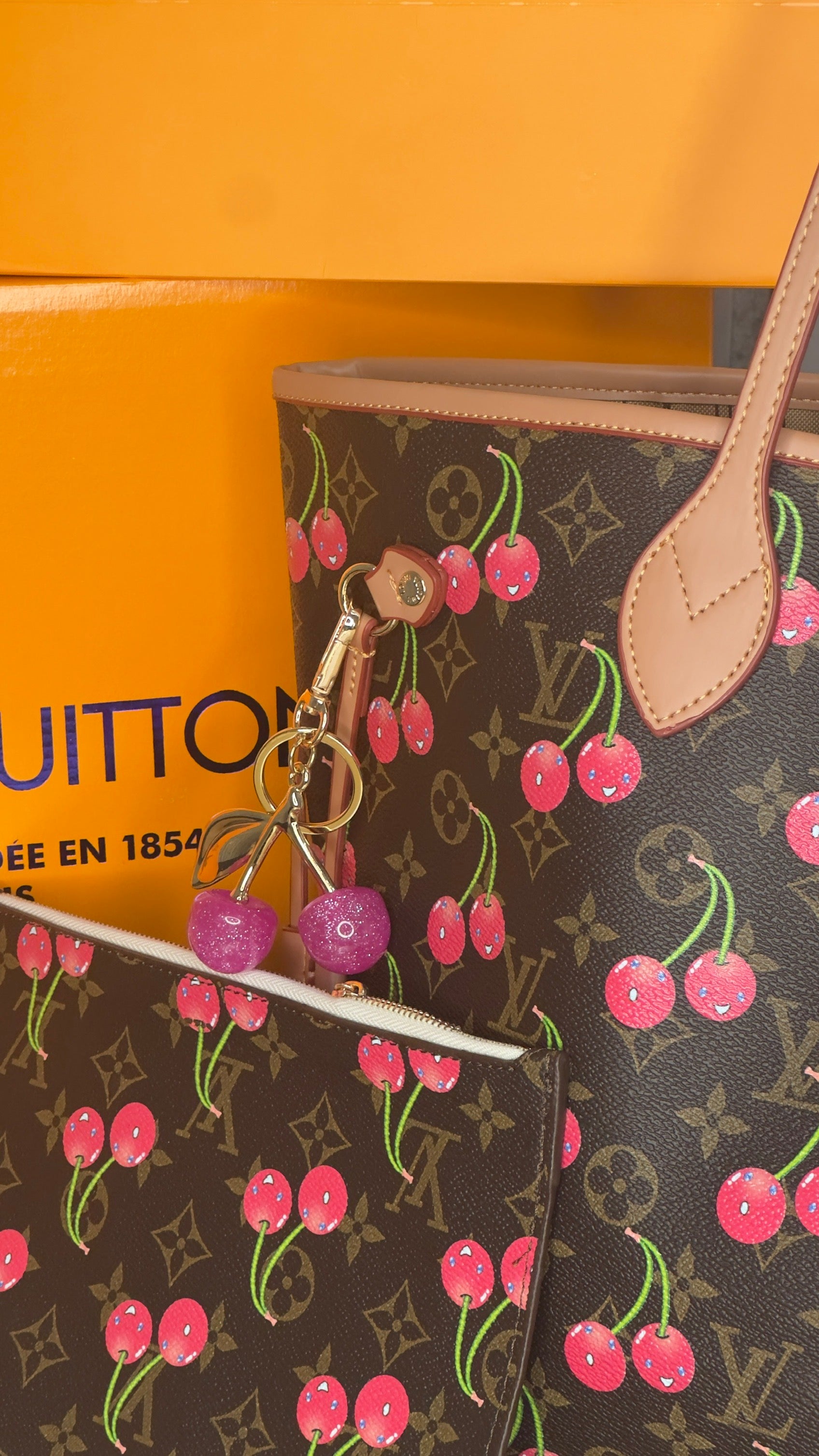 Η Louis Vuitton Neverfull MM Cherry Edition με καφέ-κονιάκ τελείωμα είναι μια ξεχωριστή παραλλαγή του εμβληματικού μοντέλου. Το παιχνιδιάρικο μοτίβο κερασιών συνδυάζεται αρμονικά με τον καμβά Monogram, προσφέροντας έναν ιδανικό συνδυασμό κλασικού και μοντέρνου στυλ. Κατασκευασμένη από τεχνοδέρμα Nappa υψηλής ποιότητας, παραμένει ελαφριά και ανθεκτική για καθημερινή χρήση.