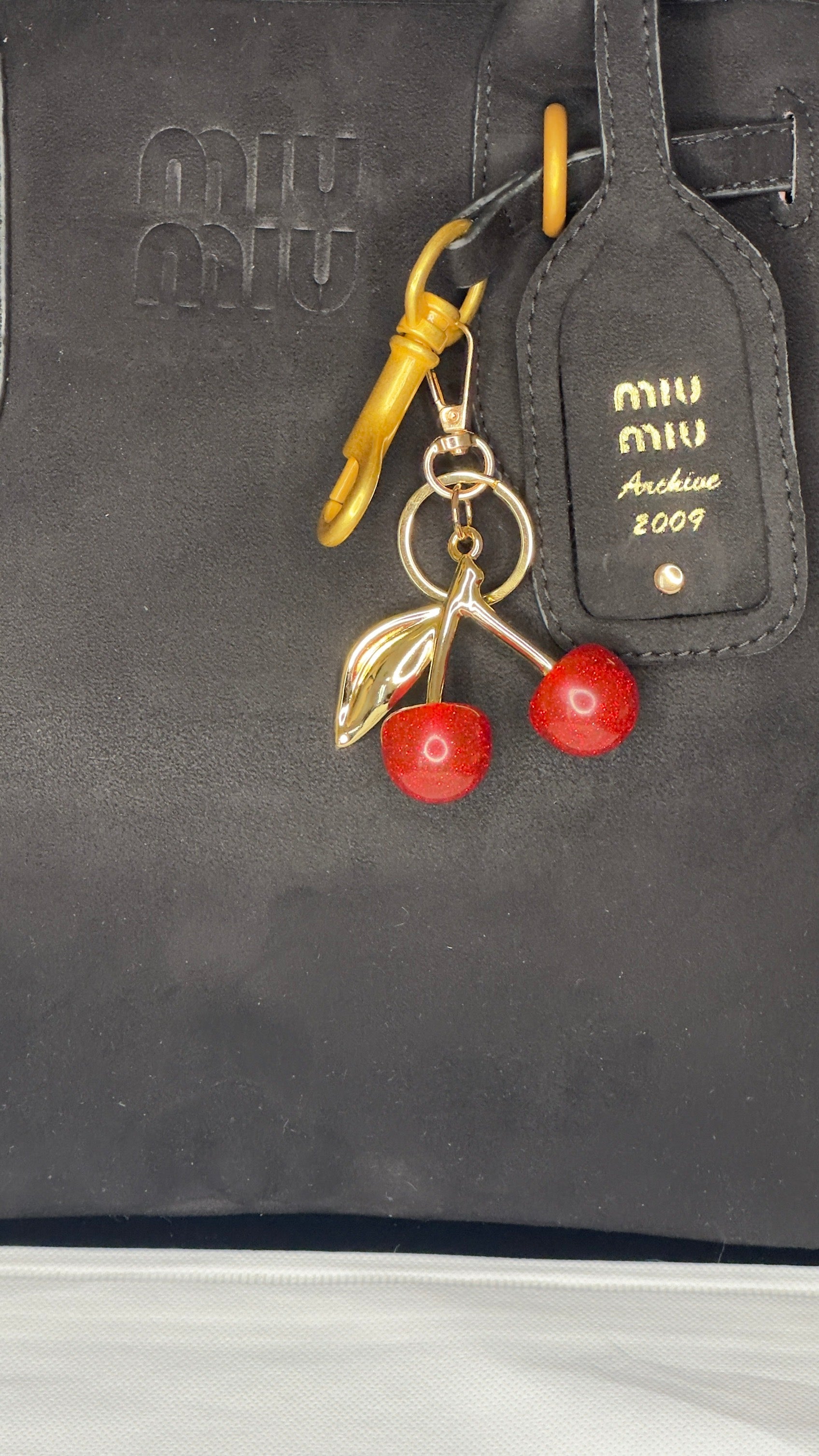 Κατασκευασμένη από γνήσιο suede καστόρι σε βαθύ μαύρο χρώμα, διαθέτει χρυσά μεταλλικά στοιχεία και διακοσμητικό cherry charm, signature λεπτομέρεια του οίκου.