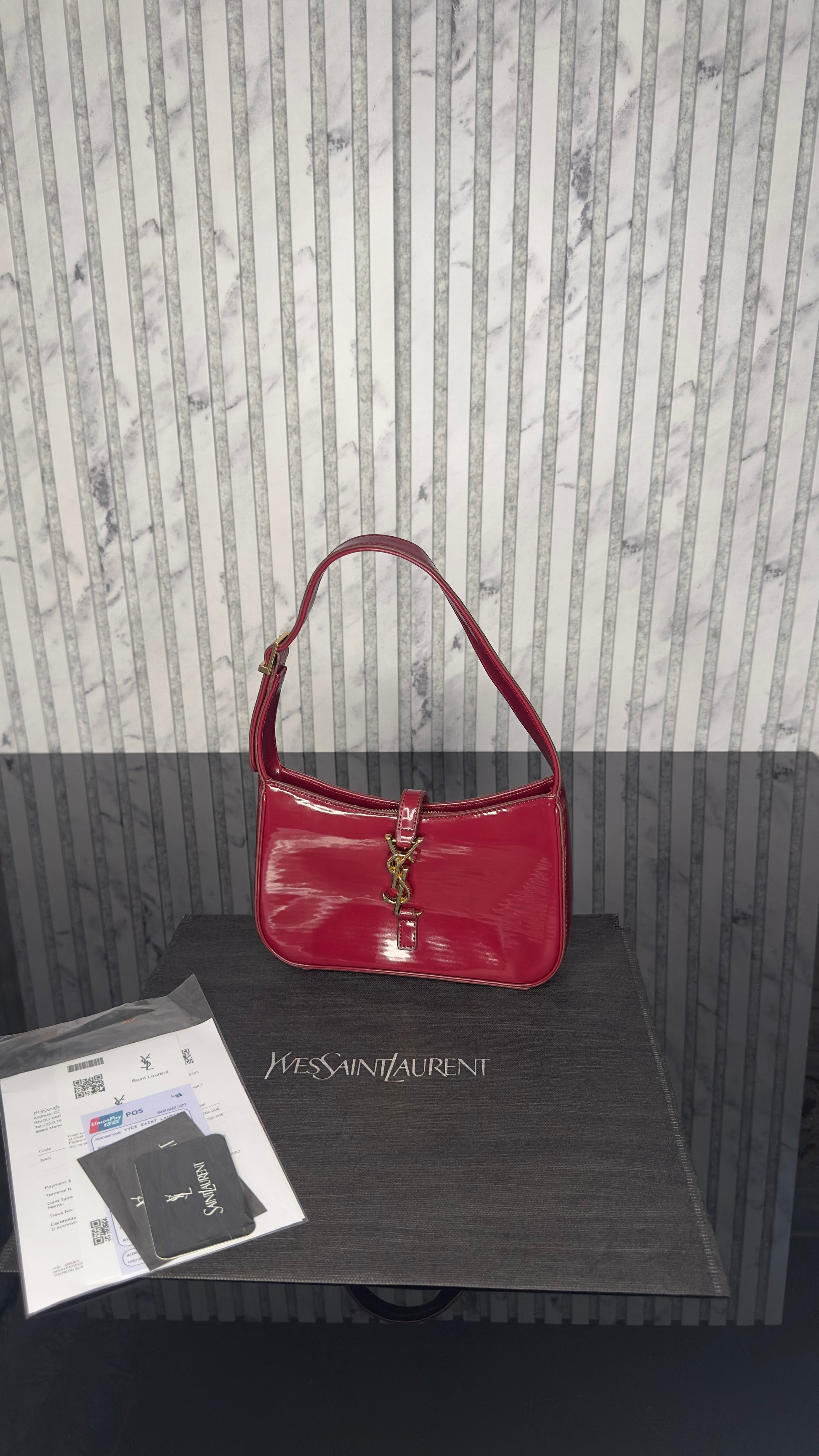 Η YSL Le 5 à 7 σε γυαλιστερό κόκκινο τεχνοδέρμα Nappa αποτελεί έναν τέλειο συνδυασμό ρετρό αισθητικής και σύγχρονου glamour. Η χαρακτηριστική χρυσή μεταλλική αγκράφα YSL στο κέντρο αποπνέει πολυτέλεια, ενώ το βαθύ κόκκινο χρώμα χαρίζει μια έντονη αλλά κομψή πινελιά σε κάθε εμφάνιση.